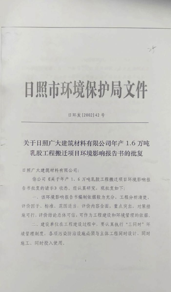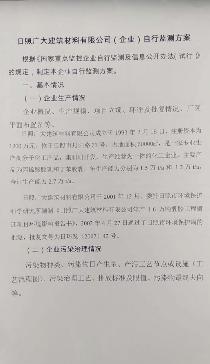 日照廣大建筑材料有限公司,位于風(fēng)景秀麗的海濱城市山東日照,成立于1988年,是專業(yè)生產(chǎn)高分子化工產(chǎn)品,集科研開發(fā)、生產(chǎn)經(jīng)營(yíng)為一體的化工企業(yè),主要產(chǎn)品為丙烯酸脂類乳液和丁苯膠乳。是國(guó)內(nèi)目前江北同行業(yè)產(chǎn)銷量最大企業(yè)之一。